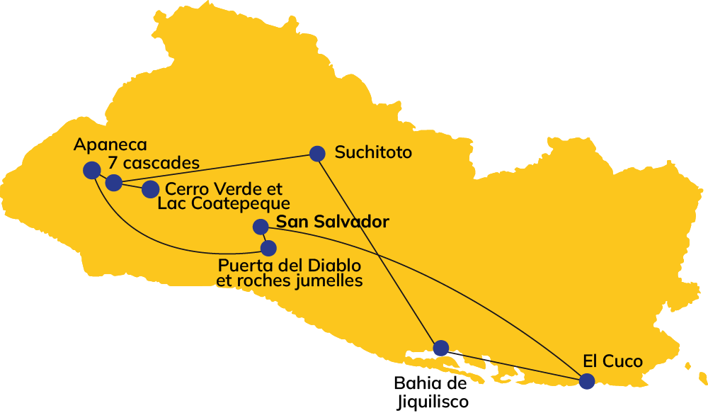 | 1-2 | San Salvador | Hôtel Terrabella *** ou Hôtel Arbol de Fuego *** ou similaire | Hôtel Barcelo **** ou Hôtel Sheraton **** ou similaire |