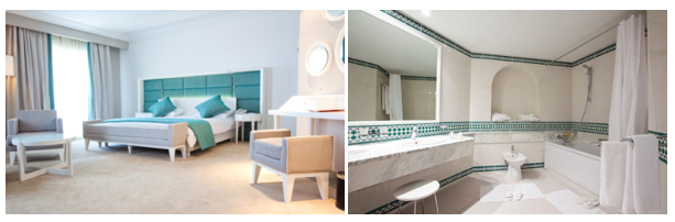 L’établissement dispose de 377 chambres doubles, dont 32 suites juniors et une suite présidentielle, toutes équipées pour un confort optimal : climatiseur individuel, balcon ou terrasse avec vue sur la mer, salle de bains spacieuse avec toilettes séparées, téléphone direct, TV satellite, sèche-cheveux, minifrigo et coffre-fort.