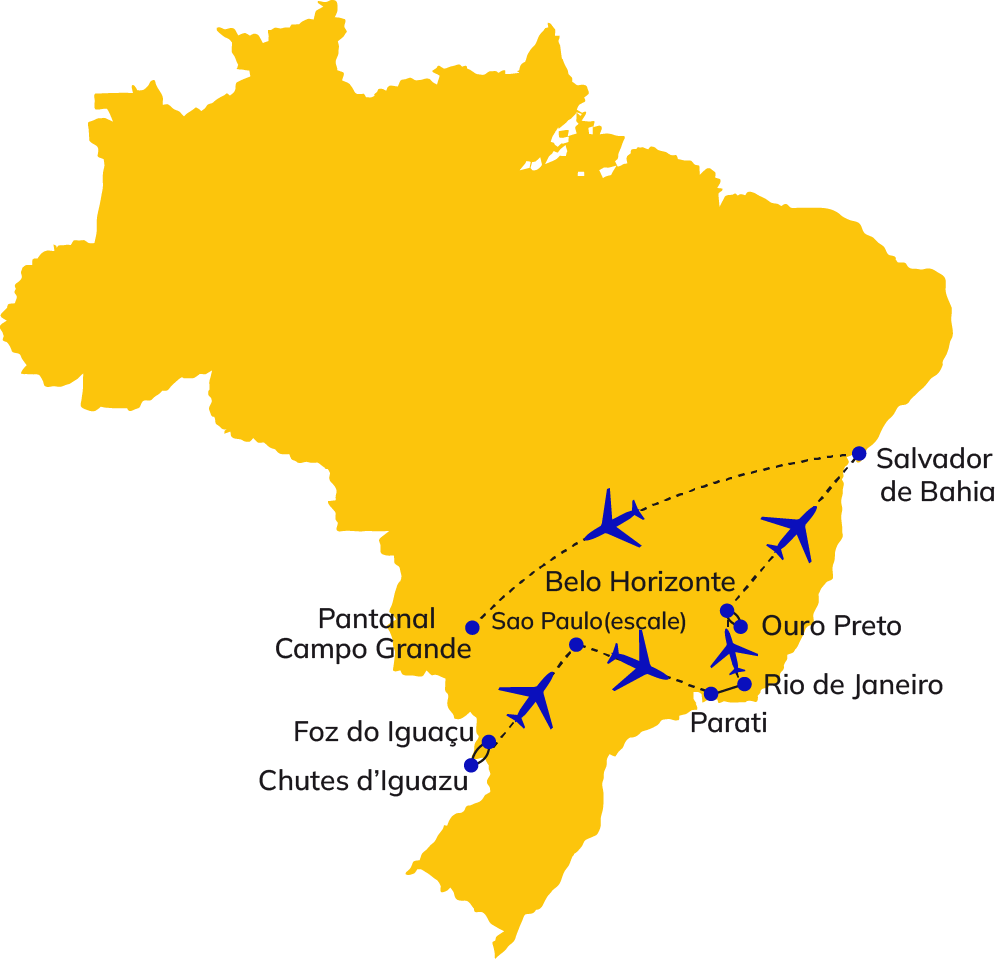 • Les vols intérieurs avec escales possibles : IGU/SAO/RIO/CNF/SSA ur compagnie régulière (LATAM, Azul, ou Gol)